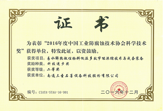 三圣石墨的“易水解熱敏性物料低溫多效節能濃縮技術與裝備”獲得中國工業防腐蝕技術協會頒發的科技進步二等獎。此次評獎一等獎空缺,我公司獲得的獎項為石墨設備行業唯一的一個二等獎。